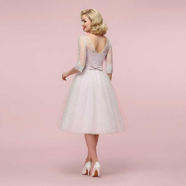 Super cute short tea length wedding dress made with polka dot tulle and accented with a satin bow at the back.