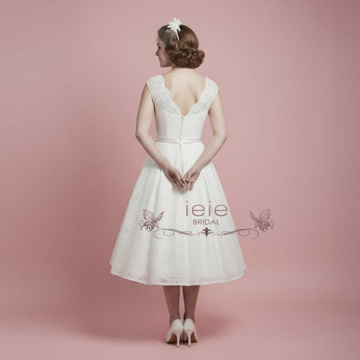 Vintage Style Lace Tea Length Wedding Dress with Pleated Skirt CAROLINE