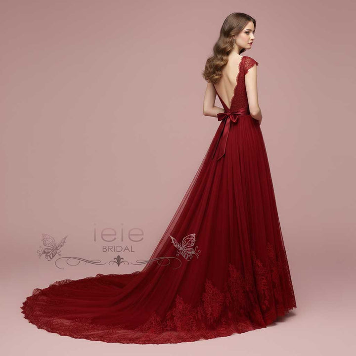 Beautiful vintage style lace wedding dress in burgundy, another version of our popular Charissa but with a lower natural waistline.