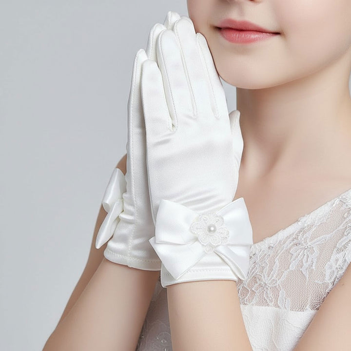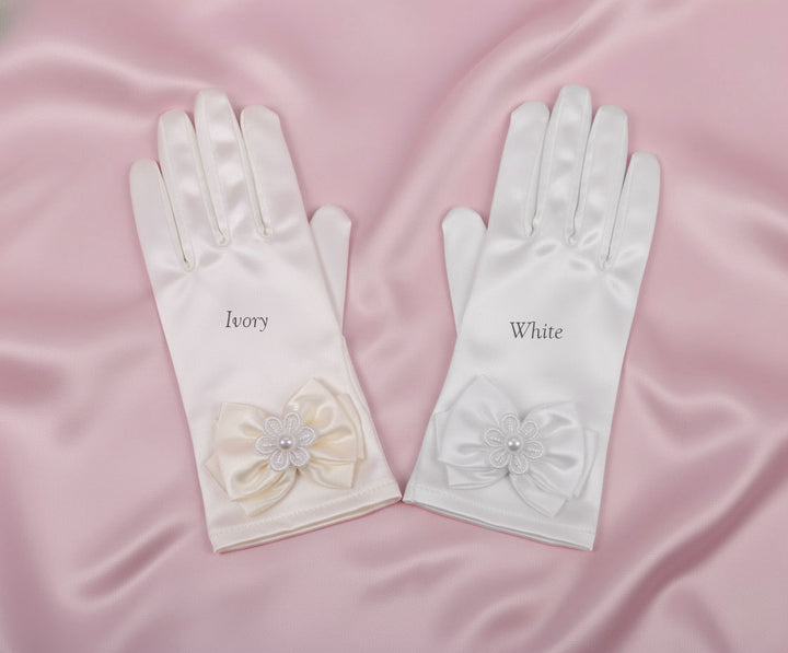 Elegant Flower Girl Gloves with Satin Bow & Pearl Flower