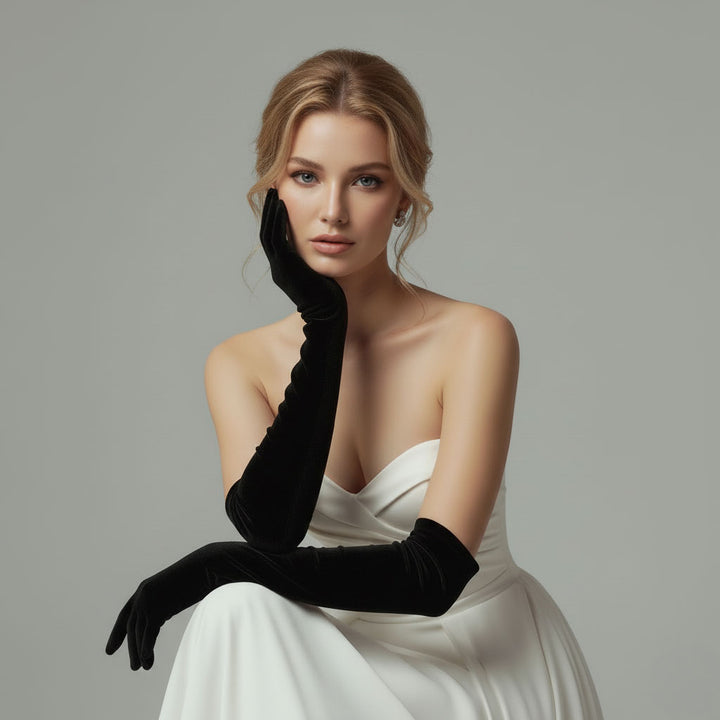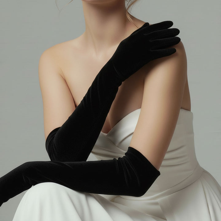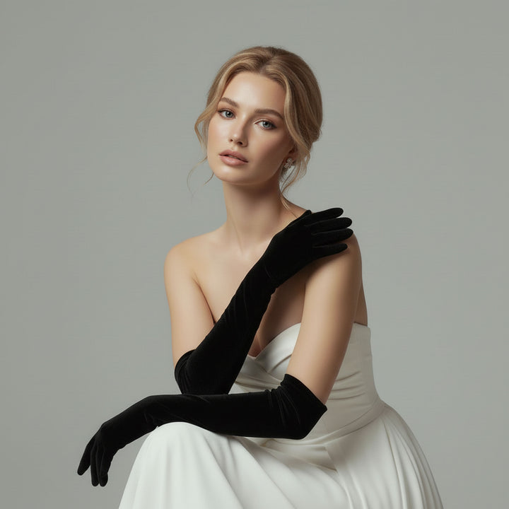 Long black opera gloves made from from soft, luxurious velvet. Perfect for opera, stage performances, or sophisticated events. Their sleek design enhances any gown, ensuring you stand out with grace and style.