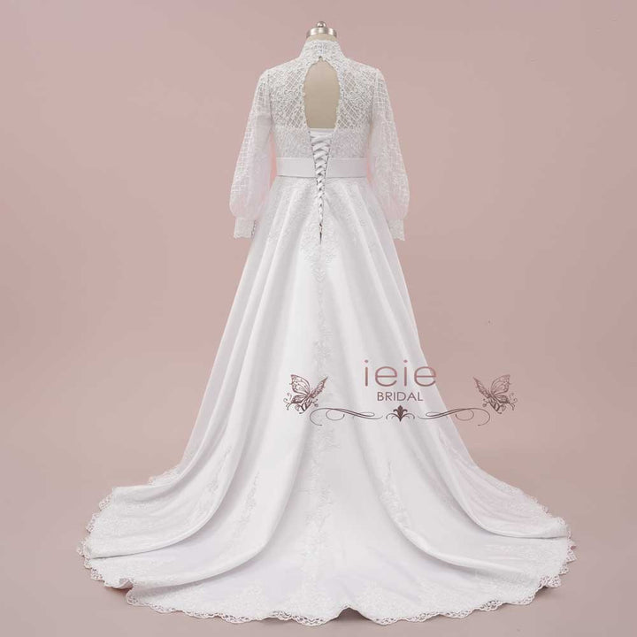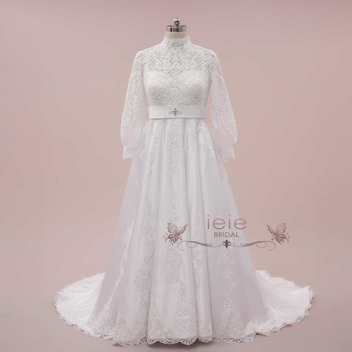 Beautiful lace wedding dress with long bishop sleeves, with modest high neck and illusion neckline.