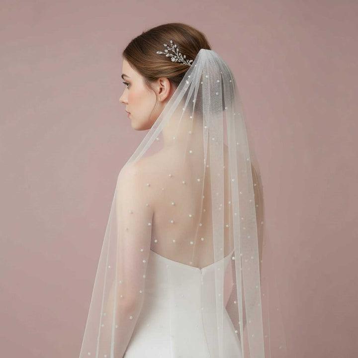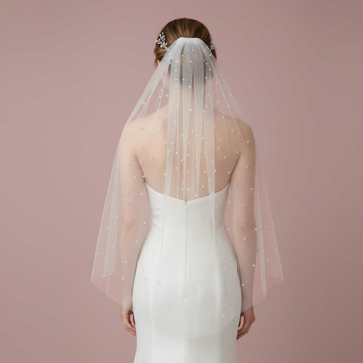 A luxurious pearl adnored veil in fingertip length. Crafted with the fine soft tulle and adorned with delicate pearls, this veil is a showstopper that will make your wedding look truly special.